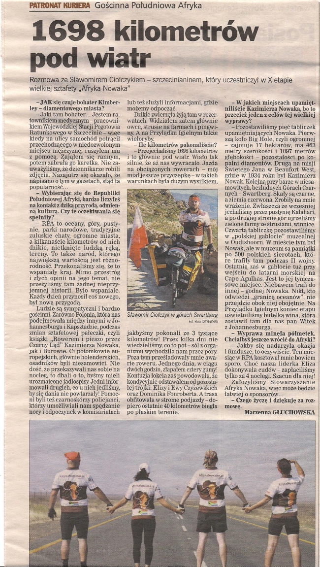 Zapraszamy do lektury wywiadu Marzenny Głuchowskiej z jednym z uczestników X etapu Afryki Nowaka (RPA I). Tekst nosi tytuł „1698 kilometrów pod wiatr”:
