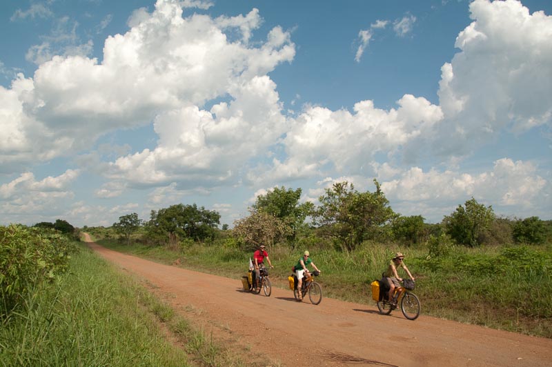 Z Gulu jedziemy przez Koc, Anaka, Purongo do Parku Narodowego Murchinson Falls. Wjeżdżamy przez Wankwar Gate, nie mając absolutnie pewności czy wolno tu poruszać się na rowerach. Jesteśmy pierwszymi w historii cyklistami wkraczającymi tędy do parku! Jednak po szeregu przestróg jak się zachować przy spotkaniu z dzikimi zwierzętami, dostajemy zielone światło. Nieprawdopodobnie, tuż za granicą parku znajdujemy się w świecie jakby chwilę po jego stworzeniu. Na zielonych wzgórzach pasą się tysiące gazel i antylop. Są na wyciągnięcie ręki, nie odgrodzone żadną szybą i warkotem silnika. Niewiele robią sobie z naszej obecności. Ot, podbiegną kawałek, przetną nam drogę, poprzyglądają się zaciekawione. Widzimy także stada żyraf, słonie, guźce, pawiany, no i bawoły – jedne z najgroźniejszych afrykańskich zwierząt. Gdy zaczynają galopować, w odległości 20-30 metrów od naszych Brennaborów, naprawdę czujemy wielki respekt. Niestety droga ponownie wiedzie przez rejon nawiedzony przez muchy tse-tse. Repelenty nie pomagają, insekty niemożliwe dokuczają, lecz nie pozostaje nic innego jak mocniej naciskać na pedały i wymachiwać łapami, by jak najszybciej opuścić „skażony” teren.