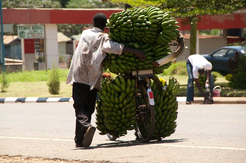 Sprzed bramy świątyni rozpościera się cudowny widok na zielone wzgórza Afryki. Tak, nasz etap z powodzeniem, za Hemingwayem, nazywać mógłby się „Zielone wzgórza Afryki”. Taki właśnie jest ten kraj: pagórkowaty i zielony do granic możliwości! Nazwa „Bananarama” jest jednak bardziej rowerowa, a wszak Uganda to kraj bananów. Jest ich tu z kilkanaście odmian, począwszy od zielonych, pastewnych matoke niczym nie różniących się od naszych ziemniaków, po znane nam słodkie, żółte gatunki. Codziennie widzimy też ludzi pchających rowery, obładowane do granic możliwości zielonymi kiśćami bananów. Banan na ramę i banda Uganda! Rekordziści transportują w ten sposób pod sto kilo kiściastych owoców, na raz!
