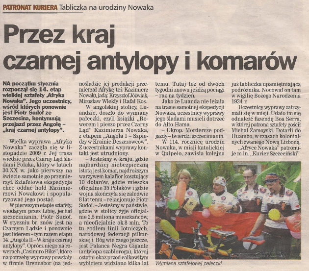 Artykuł w patronującym Afryce Nowaka „Kurierze Szczecińskim” z 17 stycznia 2011 roku. Relacja z przekazania pałeczki między etapami 14. i 15. oraz informacja o zawieszeniu tabliczki w katolickiej misji w Quipeio dokładnie w 114. rocznicę urodzin Kazimierza Nowaka.