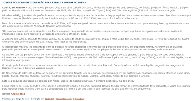 Internetowy dziennik „Leste de Angola”, powołując się na Angola Press, krajową agencję prasową, tak napisał o Afryce Nowaka 30 stycznia 2011 roku: