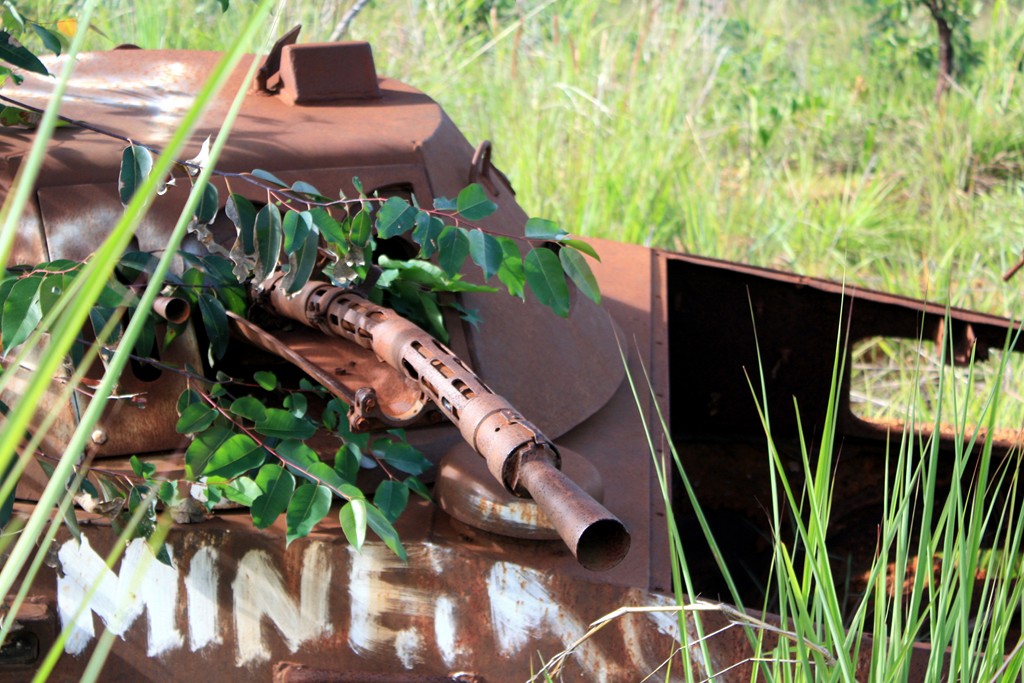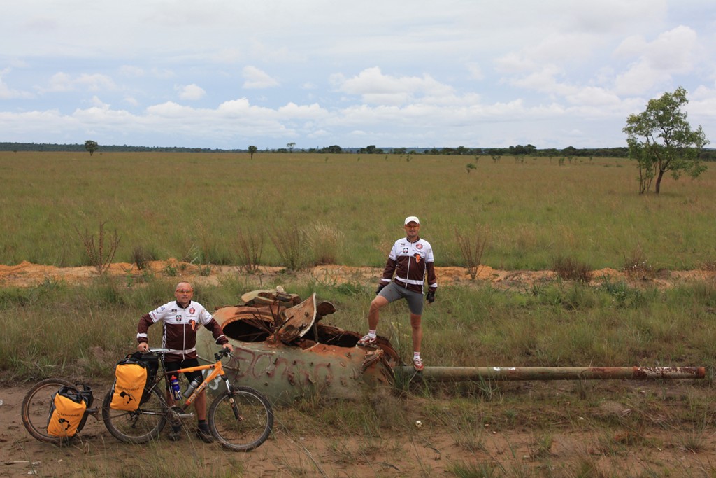 Najpierw jechaliśmy przez lasy eukaliptusowe nowiuteńką przepiękną „asfaltówką”. Słoneczko świeciło, wietrzyk delikatnie powiewał z tyłu, a od czasu do czasu na poboczu straszyły koślawe, powykręcane i pokryte rdzą duchy minionej wojny. Czołgi, działa artyleryjskie, wozy opancerzone, ciężarówki. Ostrzegano nas przed nimi. Jeszcze na wyjeździe z Huambo odwiedziliśmy biuro jednej z międzynarodowych organizacji odminowujących Angolę – Hallo Trust i tam oprócz przeglądu min poinstruowano nas o niebezpieczeństwach lekkomyślnego zwiedzania takich powojennych skorup. Okazuje się bowiem, że takie niby porzucone i zdewastowane powojenne sprzęty to jedno z bardziej typowych miejsc podkładania min i innych zasadzek mających na celu wysadzenie w powietrze zbyt dociekliwego wielbiciela militariów.