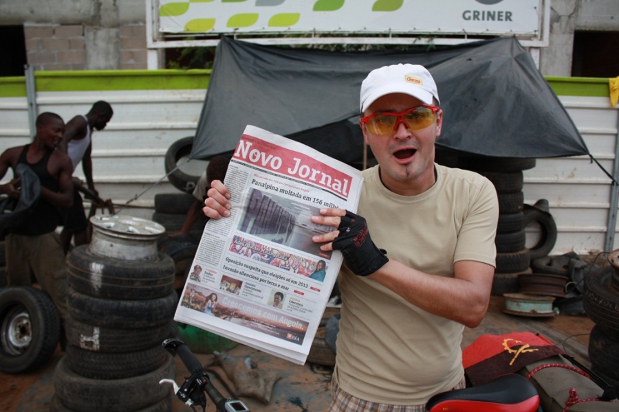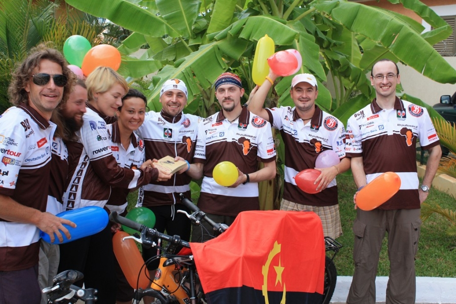 W gościnnych progach Mirka Łajło, naszego dobroczyńcy w Luandzie, przejmujemy pałeczkę sztafetową. Uroczystość ma charakter sylwestrowy. Są balony. Intensywne kolory flagi narodowej Angoli mieszają się z żywą zielenią palmowych liści i słoneczną barwą ram naszych rowerów.