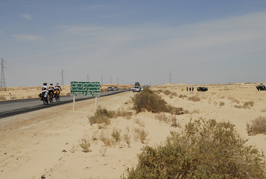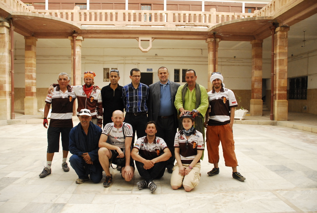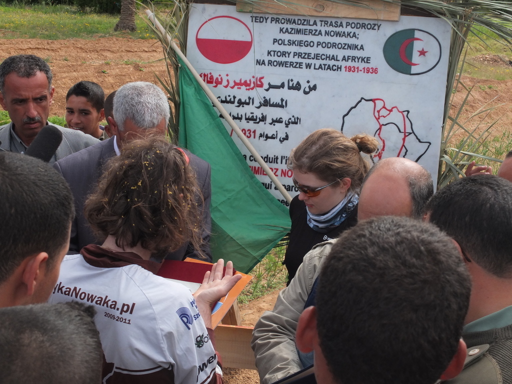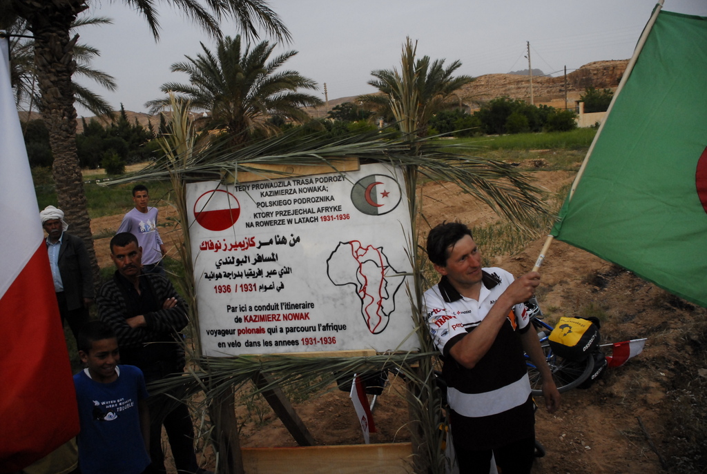 Na wjeździe do Biskry towarzyszył nam pierwszy algierski bocian oraz obstawa na motocyklach w akompaniamencie policyjnych kogutów! Jechaliśmy dostojnym tempem, tak by zgromadzeni na chodnikach mieszkańcy mogli nasycić wzrok naszym widokiem i odpowiadać na kierowane do nich gesty pozdrowień. „Let’s go, please!” brzmiało w naszych uszach, gdy „psiogłodni” marzyliśmy o obiedzie po całym dniu jazdy. Ale nie było na to czasu – pędziliśmy do merostwa, gdzie osobiście uścisnął naszą dłoń mer miasta. I chyba w tym momencie zdaliśmy sobie sprawę z tego, że nasi algierscy przyjaciele, szczegółowo realizują szkic trasy, który w trakcie przygotowań etapu został im wysłany z myślą, że to zwykła formalność do otrzymania wiz wjazdowych. Ale skoro Nowak był w merostwie, i my tam musieliśmy być. Na dziedzińcu urzędu umieściliśmy od razu trzecią tabliczkę, a kolejny dzień chcieliśmy w całości poświęcić na odpoczynek. Nocowaliśmy na terenie rezydencji kandydata na posła z partii rządzącej. To właśnie tam przy kolacji z oficjelami po raz kolejny przekonaliśmy się, że plan znów został już opracowany za nas i następnego dnia powinniśmy się stawić w maleńkiej miejscowości Chaiba (czyt. szajba). No więc nici z regeneracji sił. Na ponad 90 km trasę z Biskry do Chaiby zdecydowały się tylko Leszki – Julia, Kuba i Norbert wykorzystali wreszcie towarzyszący samochód Bashira na regenerację rozstrojonych żołądków i kolana, kibicując zza szyby auta chłopakom. Od peletonu odłączyli się również algierscy kolarze – Krimo, Toufik i Mouloud, którzy w towarzystwie żandarmerii nie byli w stanie odnaleźć „ducha Nowaka” i pojechali na kilka dni do Algieru – z planem ponownego podłączenia się na ostatnim odcinku trasy.