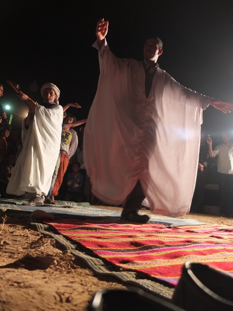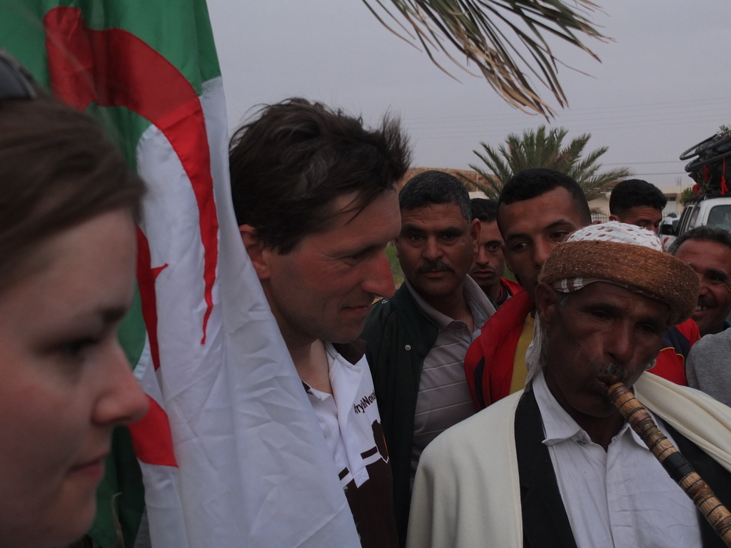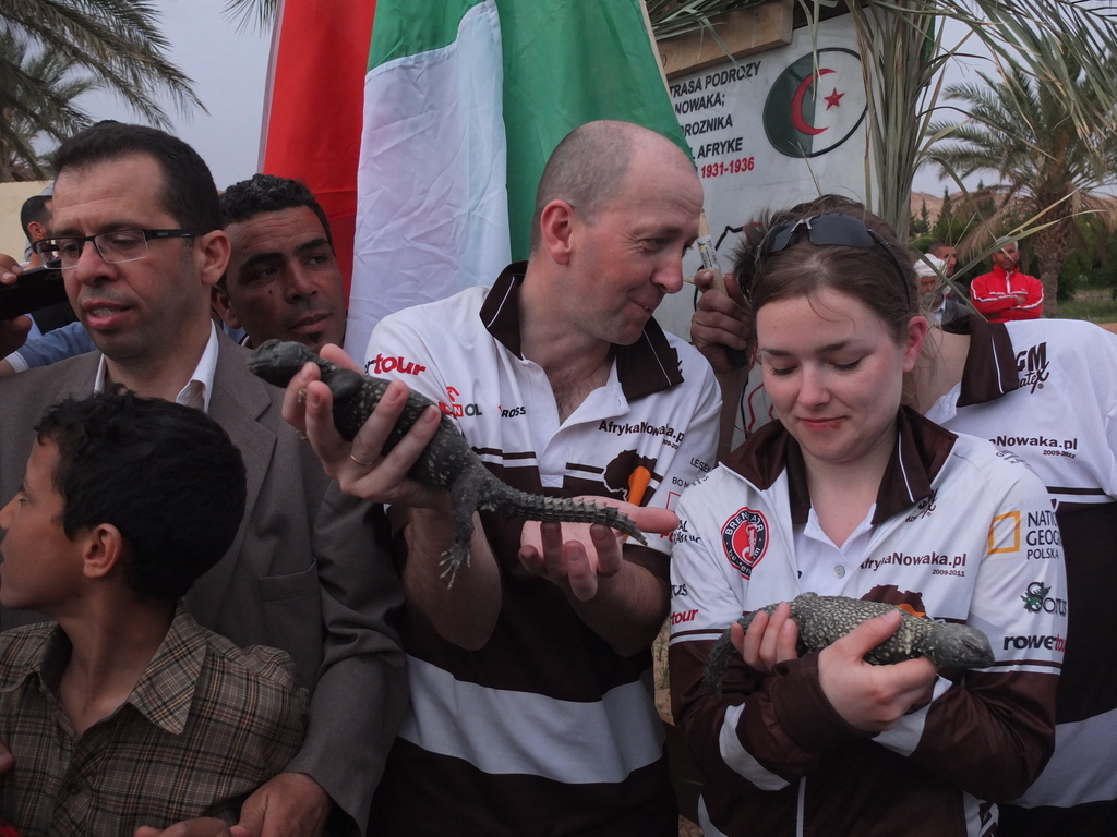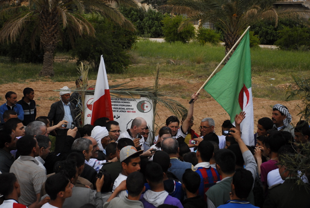W okrojonym składzie dotarliśmy do maleńkiej miejscowości Chaiba, gdzie powitał nas tłum mieszkańców, głównie dzieci oraz kilkunastu przedstawicieli lokalnych władz. Ku naszemu zaskoczeniu czekała tam na nas również marmurowa replika tabliczki nowakowej w skali makro, przygotowana na zlecenie dyrektora turystyki znanego nam już z Biskry. Kolejna, jeszcze większa makroreplika ma zostać wykuta na zboczu góry otaczającej miasteczko – historia Nowaka zrobiła tu wielką furorę! Całokształtu zastanego widowiska dopełnił występ lokalnego poety-pieśniarza oraz grajków. W rytm ich melodii mężczyźni rozpoczęli tańce przywdziewając przeznaczone do tego białe szaty. Kuba z czasem stał się wodzirejem tańczących po zmroku „białych duchów”, dzięki czemu przylgnął do niego przydomek „president of Chaiba”! Istna szajba! Wszystkiemu przyglądał się w milczeniu doradca ministra turystyki (mówiący po polsku!). To on usłyszawszy nasze komentarze, poprosił, aby żandarmeria na czas występów lokalnych artystów, wpuściła na dziedziniec ogrodu dzieciaki, wypchnięte przed chwilą za bramę. Choć przez chwilę mogliśmy poczuć, że jesteśmy wśród zwykłych ludzi, a nie w rządowej delegacji.
