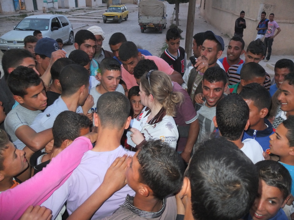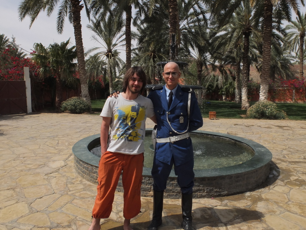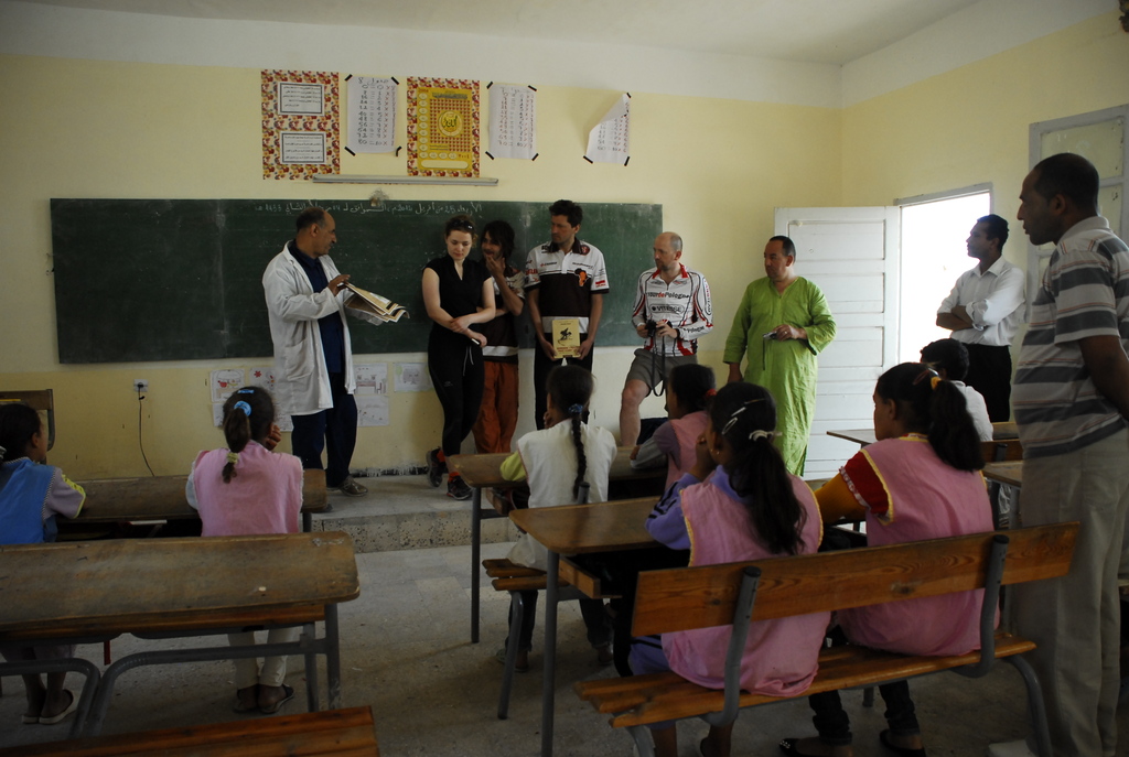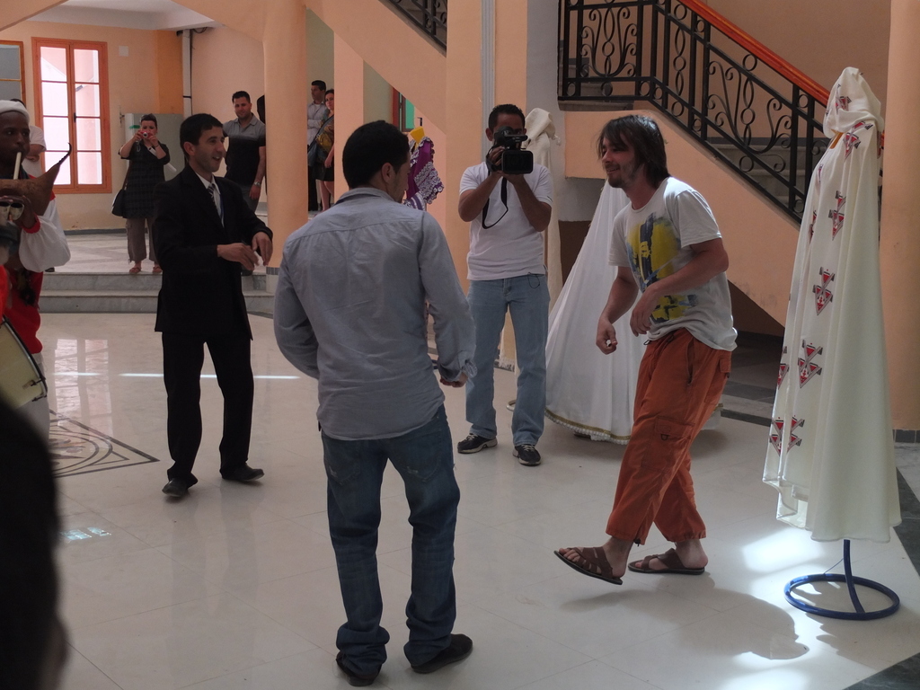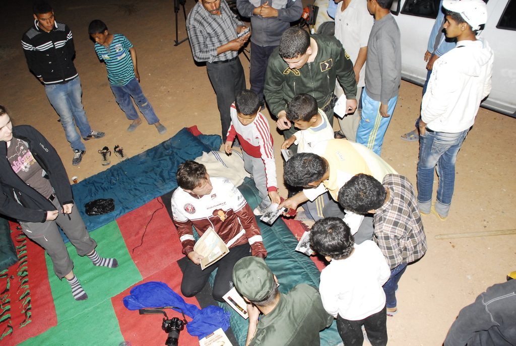 W okrojonym składzie dotarliśmy do maleńkiej miejscowości Chaiba, gdzie powitał nas tłum mieszkańców, głównie dzieci oraz kilkunastu przedstawicieli lokalnych władz. Ku naszemu zaskoczeniu czekała tam na nas również marmurowa replika tabliczki nowakowej w skali makro, przygotowana na zlecenie dyrektora turystyki znanego nam już z Biskry. Kolejna, jeszcze większa makroreplika ma zostać wykuta na zboczu góry otaczającej miasteczko – historia Nowaka zrobiła tu wielką furorę! Całokształtu zastanego widowiska dopełnił występ lokalnego poety-pieśniarza oraz grajków. W rytm ich melodii mężczyźni rozpoczęli tańce przywdziewając przeznaczone do tego białe szaty. Kuba z czasem stał się wodzirejem tańczących po zmroku „białych duchów”, dzięki czemu przylgnął do niego przydomek „president of Chaiba”! Istna szajba! Wszystkiemu przyglądał się w milczeniu doradca ministra turystyki (mówiący po polsku!). To on usłyszawszy nasze komentarze, poprosił, aby żandarmeria na czas występów lokalnych artystów, wpuściła na dziedziniec ogrodu dzieciaki, wypchnięte przed chwilą za bramę. Choć przez chwilę mogliśmy poczuć, że jesteśmy wśród zwykłych ludzi, a nie w rządowej delegacji.