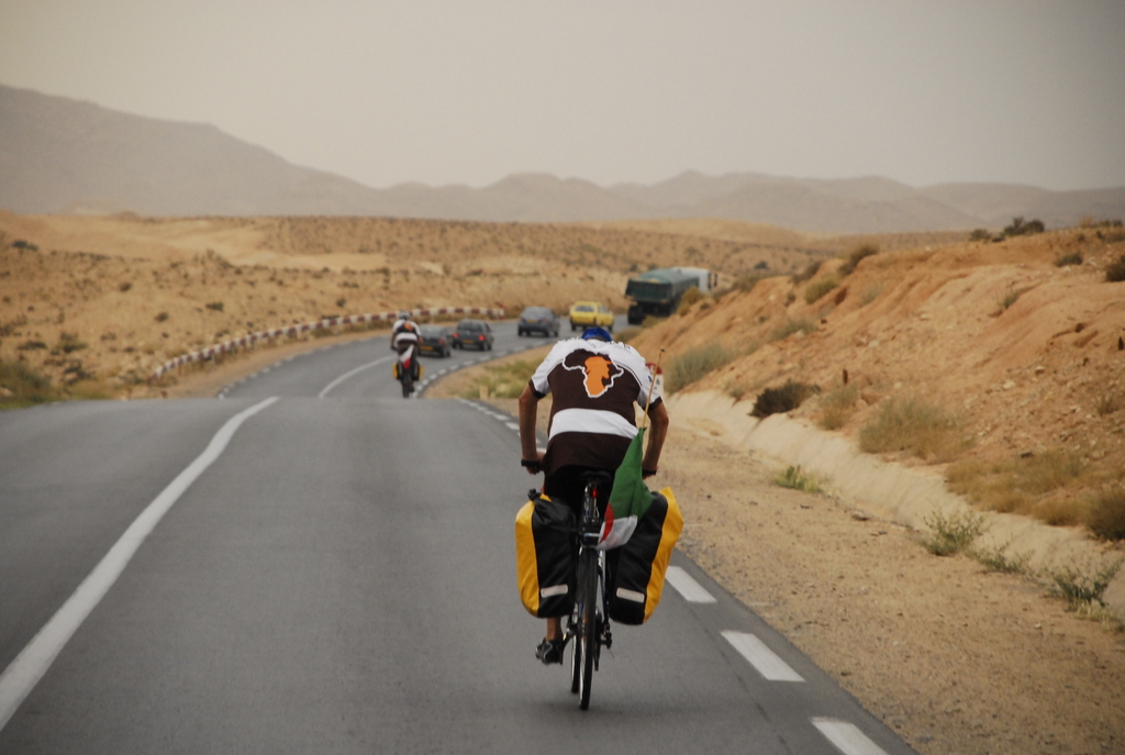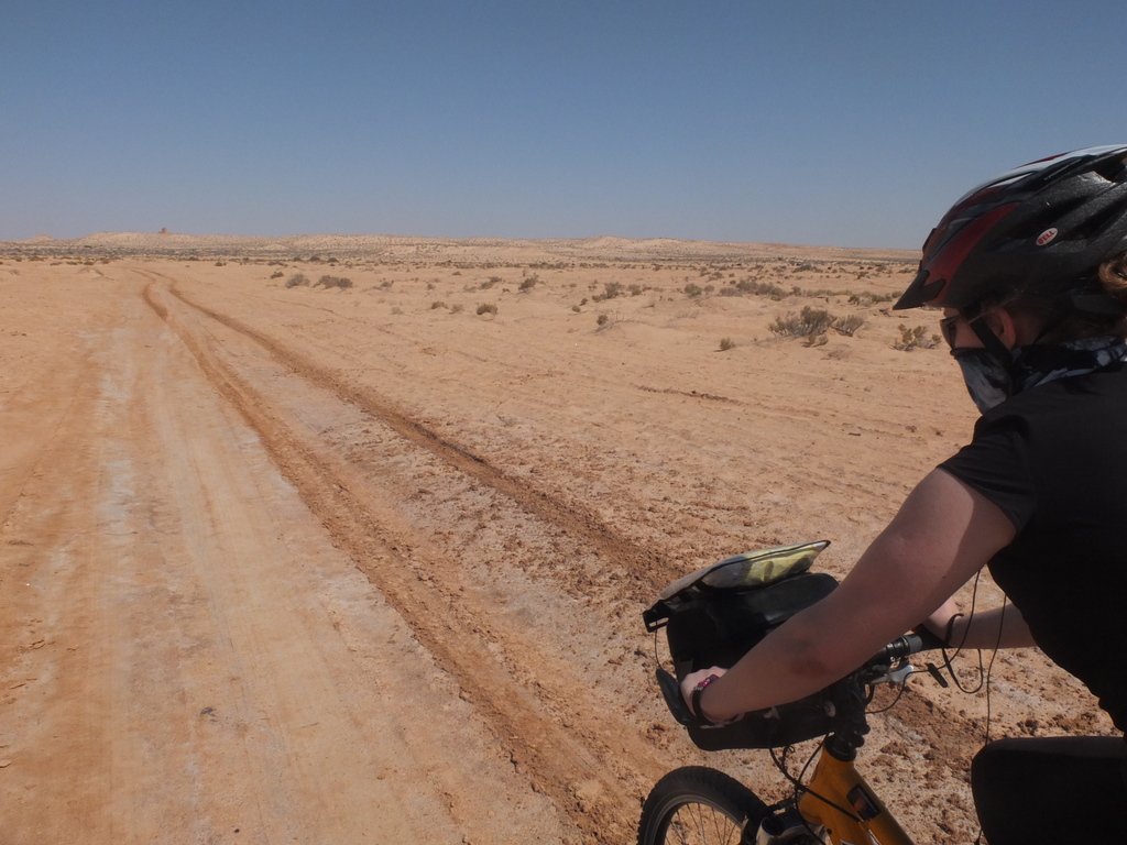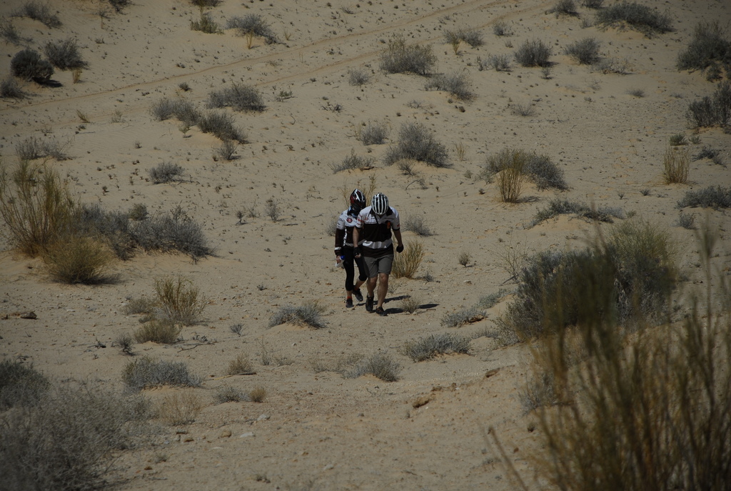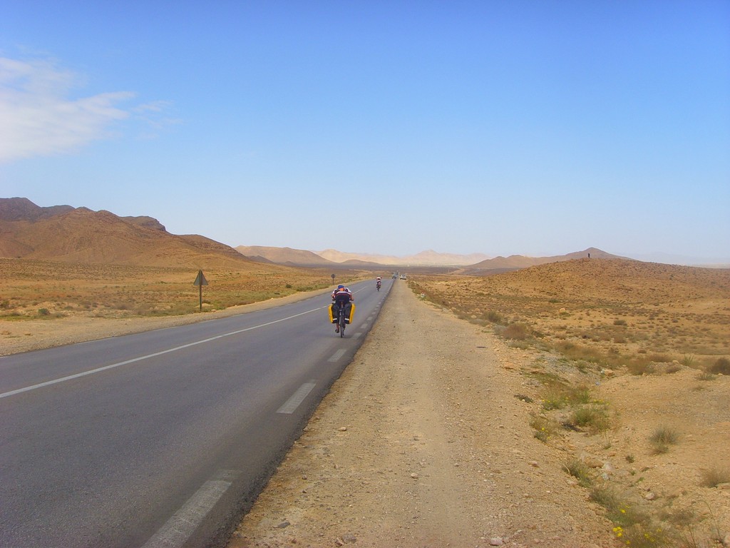 W nocy spadł pierwszy deszcz. Pierwszy nie tylko dla nas, bo również Chaiba dawno nie uświadczyła deszczu. Chłodny wiatr od gór nadmuchiwał nasze śpiwory jak balony, gdy spaliśmy w półotwartym berberskim namiocie. Nowak na drodze z Biskry do Bou Saada cierpiał z powodu zimna i musiał dzielić te trasę na 7 odcinków. Nam się udało ją pokonać w dwóch rzutach. Gdy rankiem wyruszaliśmy w drugą część trasy (Chaiba-Bou Saada), rozpogodziło się i podczas pokonywania pierwszego górskiego podjazdu w Algierii, słońce rozpieszczało nas złotymi promieniami. Potem było jeszcze przyjemniej, nie tylko dlatego, że 100 km odcinek przejechaliśmy po płaskim lub z górki. Algierska pustynia przeradzała się w bujne, zielone doliny, poprzecinane skalnymi wąwozami i korytami rzek wypełnionymi piaskiem. Te sceny jak z baśni przewijały się przed naszymi oczami aż do samego Bou Saada.