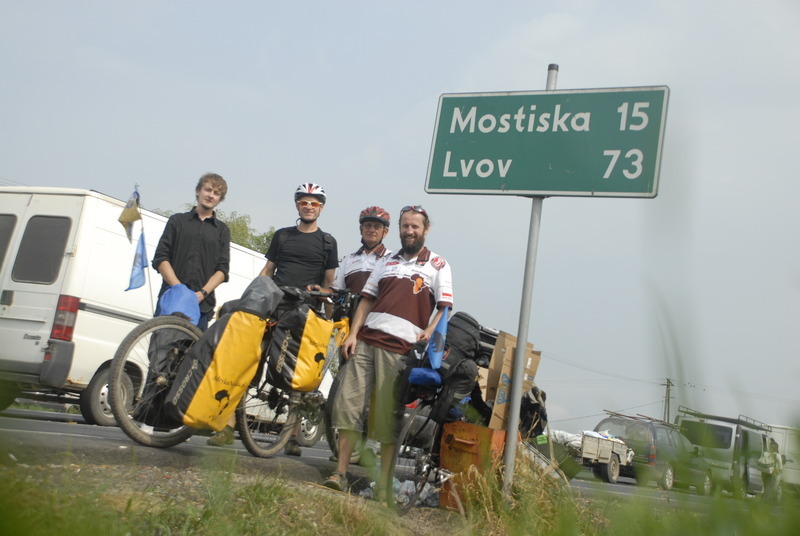 Przekraczamy polski posterunek graniczny, myk myk i po formalnościach, co prawda musiałem okazać się dodatkowym dokumentem tożsamości, bo od wyrobienia paszportu nieco urosła mi broda, ale wszystko odbyło się z uśmiechem – teraz część ukraińska, tak jak myślałem, granicy wciążnie przystosowano dla potrzeb rowerzystów, kołowrotek jak na stadionie piłkarskim skutecznie uniemożliwiał sprawne przejechanie osakwowanym rowerem z przyczepką. Zrobiliśmy więc odpowiednie zamieszanie i nawet nie zauważono dwóch, nienaturalnie wystających z sakw karimat – poczuliśmy się nawet na tyle bezpiecznie, że spróbowaliśmy namówić urzędników ,aby wstemplowali do książeczki-pałeczki graniczną pieczątkę Ukrainy, na nic jednak zdało się pokazywanie stempli z Egiptu, Sudanu, Rwandy, Zambii, RPA… jakaś napięta atmosfera panowała wśród pracowników granicy, powiedziano nam, abyśmy spróbowali w drodze powrotnej, bo „dziś to lepiej nie wołać kierownika”…