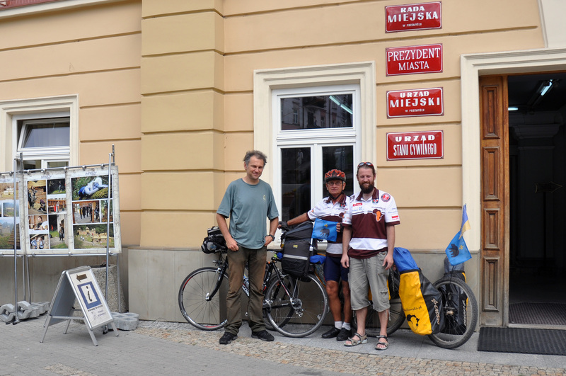 Miało być „skoro świt”, a wyszło jak zawsze, GOK w Krasiczynie „zdaliśmy” przed 10:00, najwięcej czasu zajęło nam usadawianie w sakwach sadzonek lipy i dębu, które przekazali mieszkańcy Boruszyna, abyśmy posadzili je w Stryju – tak by korzenie, które Nowak zapuścił w Wielkopolsce, wróciły do jego miejsca urodzenia – opakowaliśmy je w karimaty i mimo, że wystawały z sakw przyczepki, nie rzucały się zbytnio w oczy, wyglądając jak standardowe wyposażenie podróżników rowerowych. Kolejne 30 minut spędziliśmy na terenie tutejszego zamku – szybka audiencja u dyrekcji obiektu, wpis do etapowej książeczki pamiątkowej, zdjęcie pod zamkiem i wreszcie jedziemy w stronę granicy! Do Przemyśla jest „kilka fajnych wzniesień” – Sławek całkiem uprzejmie nie wyprzedzał mnie na podjazdach – niby to tylko kilka kilometrów od miasta, ale potu wylaliśmy dużo, bo i słońce coraz wyżej i temperatura zdążyła podskoczyć do około 25 stopni. W Przemyślu mieliśmy do wykonania kilka niezbędnych czynności: druk map wojskowych z lat trzydziestych, łączność z Radiem Szczecin i internetem, wymiana waluty. Usiedliśmy pod pomnikiem Mickiewicza, tuż przy Ratuszu, licząc na miejskie WiFi – nie upłynęło nawet 5 minut i żółte sakwy z konturem Afryki i profilem Nowaka zainteresowały jednego z przechodniów: a co Afryka Nowaka robi w Przemyślu? – padło bezpośrednie pytanie… Miły przechodzień okazał się być wytrawnym rowerzystą, który zna dobrze historię Kazimierza Nowaka i projekt sztafetowej wyprawy jego śladami – w dodatku Grzesiek Karnas pracuje w przemyskim magistracie, do którego nas zaprosił, oferując pomoc w druku historycznych mapy II Rzeczpospolitej – przemiłe spotkanie oczywiście skończyło się zaproszeniem z naszej strony na tygodniową wycieczkę po Ukrainie śladami Nowaka i wpisem do książeczki-pałeczki . Znów minęła godzina, a my wciąż byliśmy kilkanaście kilometrów od granicy… Wyjeżdżamy z miasta, dołącza się do nas Wojtek, opowiadamy o Kaziku, o tym, co robimy, dlaczego jedziemy na Ukrainę – bardzo żałuje, że nie wiedział wcześniej, bo i urlopu jeszcze trochę ma do wykorzystania i zaciekawiony sztafetą chciałby dowiedzieć się więcej – postanawia więc towarzyszyć nam aż do granicy, czas nam miło upływa na opowieściach o Afryce i polskim podróżniku… Jedziemy we dwóch obok siebie, Sławek z tyłu, słyszę co jakiś czas jego głos – pewnie rozmawia przez telefon, wykorzystując ostatnie kilometry w zasięgu polskiej telefonii, zerkam w tył, a tam kolejny rowerzysta przyłączył się do naszego minipeletonu, Krzysiek, który otrzymuje przykładny wykład o Kazimierzu Nowaku. Wreszcie granica, kolejki przed szlabanem właściwie nie ma, żegnamy się z chłopakami i podejmujemy próbę sforsowania granicy przejściem dla samochodów – niestety Pan Strażnik Graniczny jest nieprzejednany: rower to nie samochód, trzeba iść na przejście dla ruchu pieszego – na nic nasze tłumaczenia, że po stronie ukraińskiej jest kołowrotek, który skutecznie utrudnia rowerzystom przejazd, trzeba będzie sakwy rozpinać, rowery przenosić… ehhh, no i te sadzonki z Boruszyna, byłoby fajnie gdybyśmy nie musieli się z nich tłumaczyć.