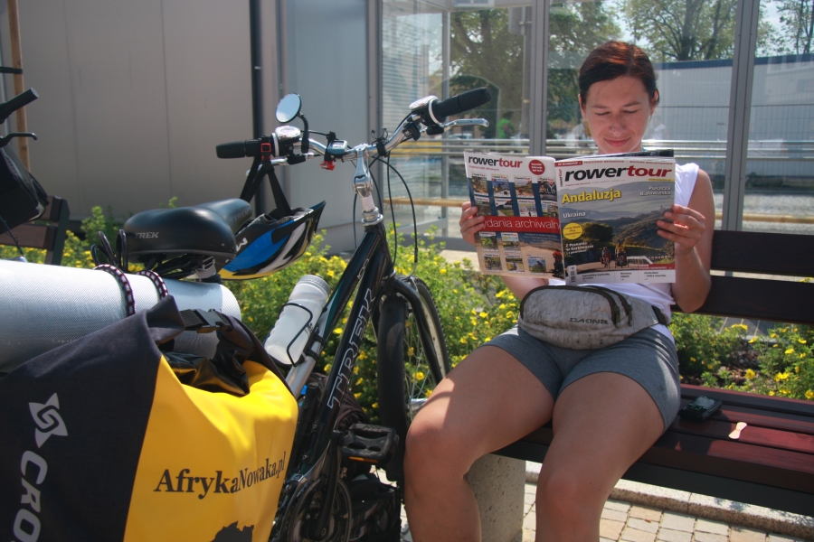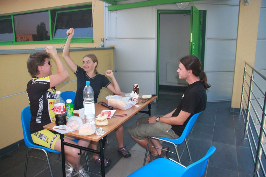 Wieczorem pokaz o Sudanie miał Grzesiek Król, prezentacja miała charakter raczej kameralny, ale i tak pojawił się kolejny wierny czytelnik Rowertouru. Brawo! A po pokazie wreszcie można było wskoczyć w kostiumy (w dużej mierze kupione na targu w Nowej Dębie godzinę wcześniej) i na bombę do basenu! Okazało się w dodatku, że to nie tyle basen, ale mały aqua park, więc i wybąbelkowaliśmy się w jacuzzi, i wygrzaliśmy się w saunie i naśmigaliśmy się na zjeżdżalni. Basen był prawie pusty, objęliśmy więc zjeżdżalnię w całkowite władanie i więcej kalorii spaliliśmy, wbiegając po jej schodkach, niż podczas całego dnia pedałując.