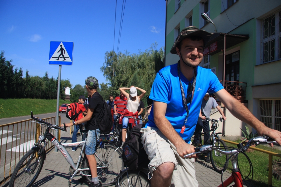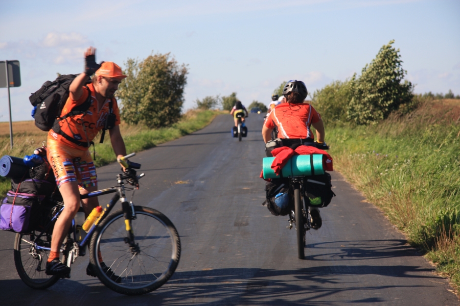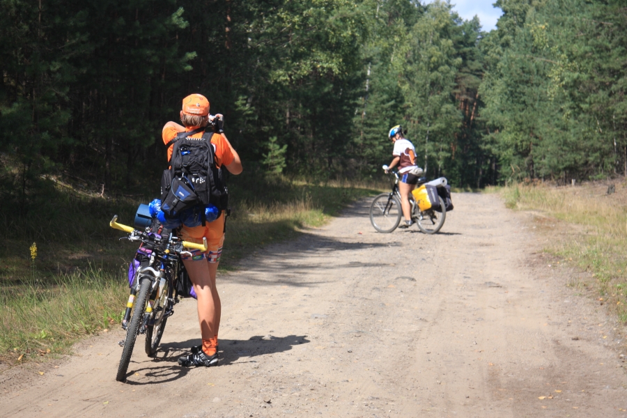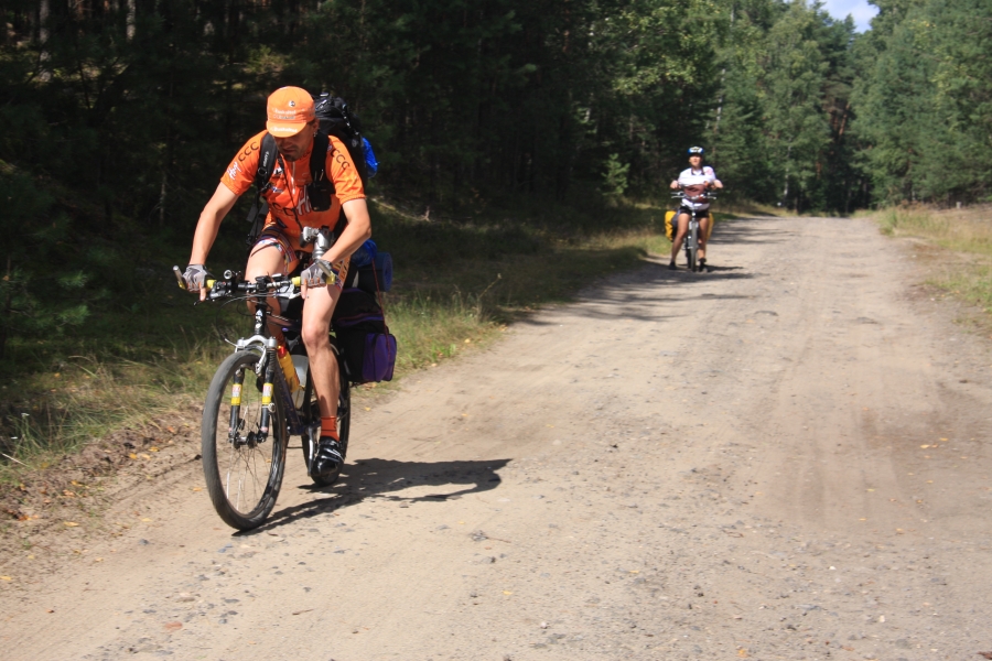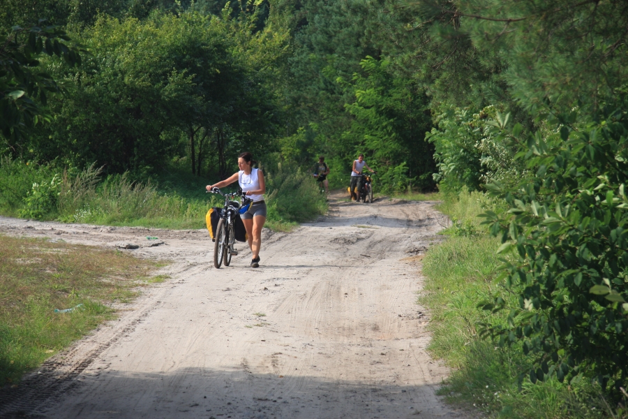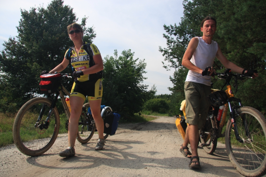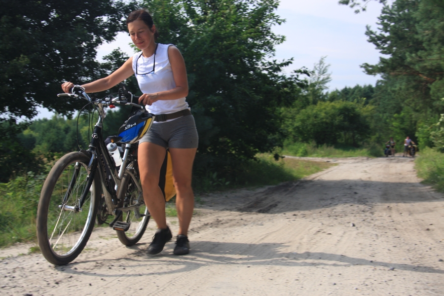 Rano opuścił nas Grzesiek i Kasper, razem pojechali do Rzeszowa, a my dalej, do Zaklikowa. Wybraliśmy trasę, która miała dwa długie fragmenty przez Puszczę Sandomierską. Pierwszy był prosty jak strzała na odcinku kilku kilometrów, utwardzony, komarów było zaledwie kilka – istna sielanka! Mknęliśmy więc wśród borów, gdzieniegdzie było jeziorko z czaplami, czasami polana. Z optymizmem więc skierowaliśmy się prosto na drugi odcinek przez Puszczę. Pierwsze metry od skrętu na skrót przez puszczę nas zupełnie zdezorientowały. Owszem, był piasek i to dużo piasku i trzeba było mozolnie pchać rowery, ale nie takie rzeczy przecież robił Nowak! Gorzej było z tą czarną chmurą na niebie. Nie, to nie nadciągająca, kolejna wakacyjna burza, to dzikie, nieprzebrane hordy komarów zwietrzyły praktycznie niczym nie osłoniętą, w tym upale skórę i niczym na kreskówce ustawiły się w kształt strzałki i zmasowanym atakiem uderzyły. Nie wiadomo było co robić – jechać i uciekać się nie da, biec przez tę pustynię też nie bardzo, a jak się po prostu szło, to mali krwiopijcy szczelnie pokrywali każdy centymetr ciała. A do tego, zupełnie niespodziewanie, momentami Sahara, na jaką trafiliśmy, zamieniała się w dżunglę w Ugandzie z wielkimi bajorami, niechybnie domami tych bezczelnych insektów. Trzeba było podjąć jakąś decyzję. Machając rękami tak, że zasililibyśmy w ekologiczną energię średniej wielkości miasteczko i jednocześnie polewając z wiadra na siebie środki przeciw komarom, zrobiliśmy głosowanie – odwrót czy „nie takie rzeczy robiło się ze szwagrem po pijaku” i brniemy dalej. Wynik: 3 do 1 dla szwagra (przeciw była jedna Kejti, ale nie wykazywała zbytnich oporów przed dalszym zanurzeniem się w jedyne na świecie skrzyżowanie pustyni z tropikalnym lasem deszczowym.