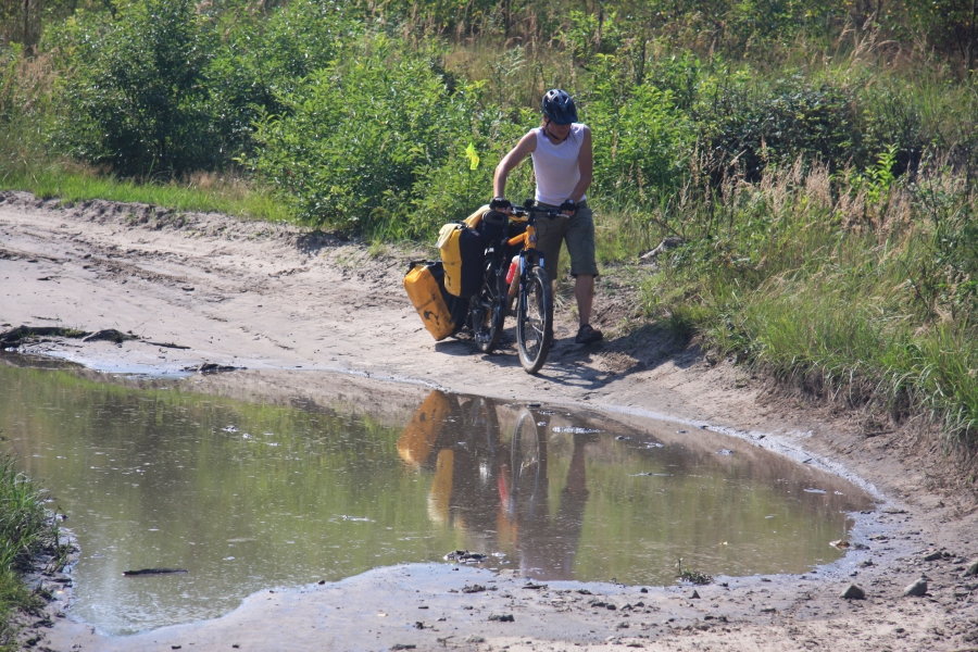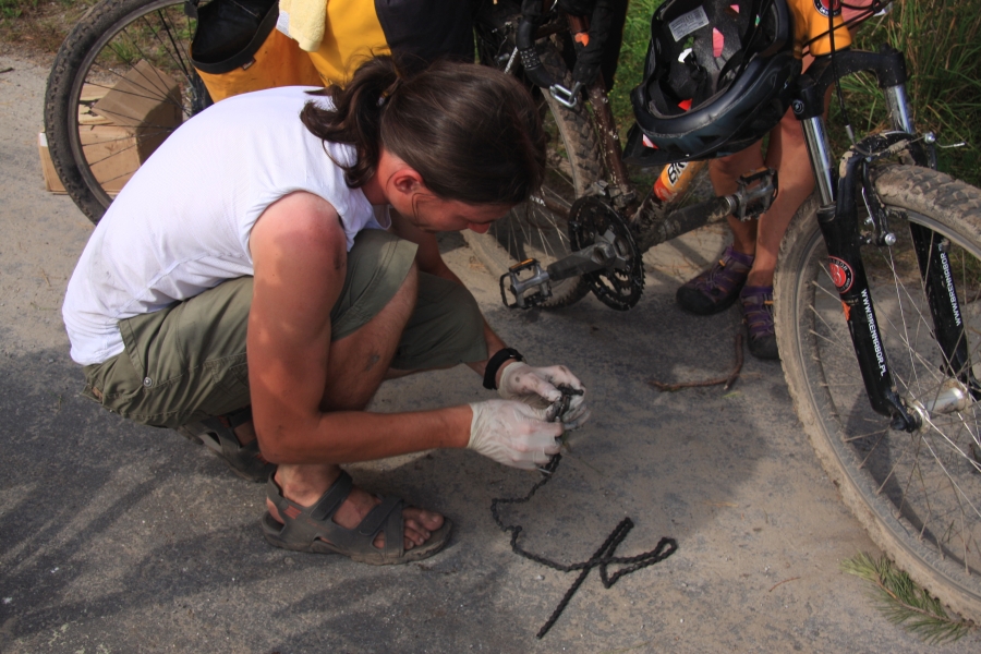 Brudni, zakurzeni, z masą bąbli, z urwanym łańcuchem (znów Michał – miał za dużo siły w nogach), wysuszeni dotarliśmy na skraj przeprawy. Asfalt! Ileż może dostarczyć on radochy!