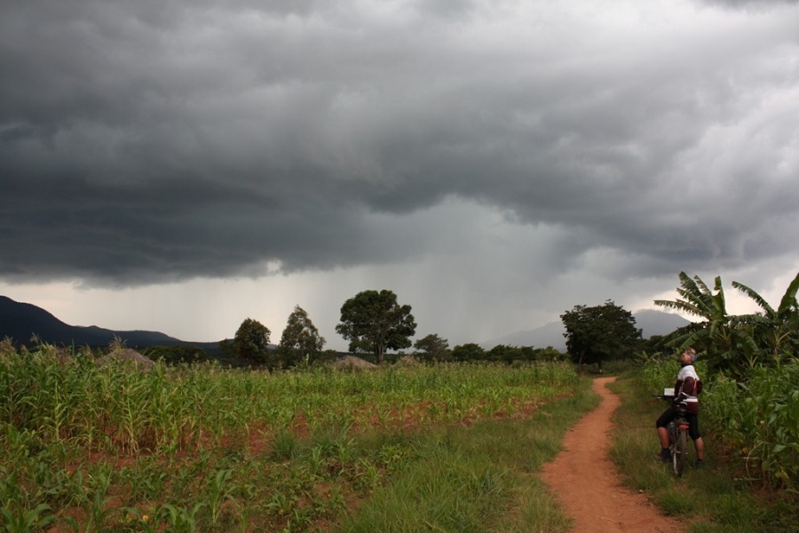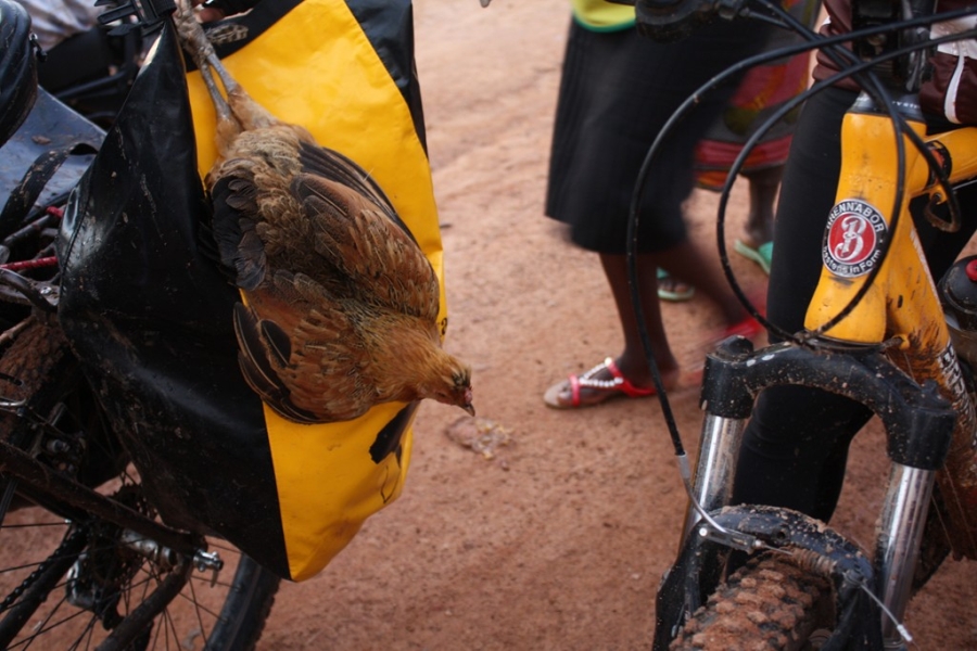 Powoli zapadał zmrok. Pedałowaliśmy z determinacją z powrotem na misję. Nasz sukces uczciliśmy zakupem dwóch żywych kur na mijanym targu. Kury przytroczyliśmy do sakw, a potem ze względów humanitarnych trzymaliśmy lewą dłonią na kierownicy związane za pazury głową w dół. Kurza melodia! Przez afrykańskie ciemności, z jedną czołówką, polscy rowerzyści utaplani w błocie i rudej mazi, gdacząc i przeklinając, po kolejnych upadkach wracali na późną kolację na Misję Quipeio.