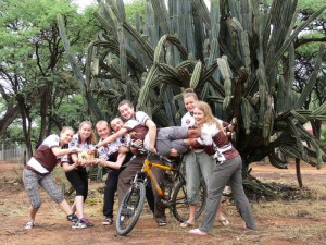 Wczoraj wieczorem nasza czwórka zawitała w Gobabis – nie obyło się oczywiście bez małych perypetii. Nasz nieoficjalny start miał miejsce w Windhoek – stolicy Namibii, skąd mieliśmy dostać się w rejony Gobabis. Niestety w Namibii to nie bułka z masłem. Brak publicznego transportu oraz brak samochodów w wypożyczalniach, w połączeniu z ogromną ilością bagażu (plecaki, przyczepki i zepsuty rower Konrada) postawiły pod znakiem zapytania nasze dalsze plany. Ale – jak to się mówi – przyjaciół poznaje się w biedzie! Dzięki nieocenionej pomocy naszego, poznanego na couch surfingu, namibijskiego przyjaciela Haiko, na pace jego samochodu przemierzyliśmy ponad 200 km aż do Gobabis, a potem do znajdującego się 15 km dalej Gunichas, gdzie spotkaliśmy się z ekipą „pędziwiatrów”.